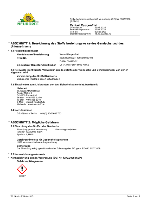 Xentari RaupenFrei*,° Sicherheitsdatenblatt 2025-07 de-DE